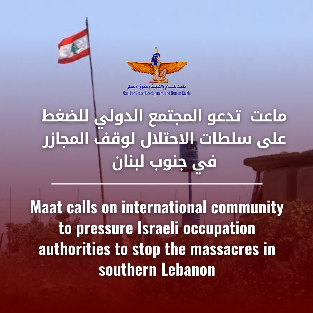 تدين مؤسسة ماعت للسلام والتنمية وحقوق الإنسان شن قوات الاحتلال الإسرائيلي لغارات جوية عسكرية عشوائية على عدد من البلدات والقرى في جنوب لبنان والبقاع وبعلبك منذ 21 سبتمبر 2024، مما أفضى إلى انتهاكات مروعة أسفرت عن خسائر فادحة في الأرواح وخلّفت دمارًا هائلًا، وألحقت أضرارًا جسيمة بالبنية التحتية المدنية، فقد قتل ما يقرب من 492مدنيًا وأصيب 1645 بجروح خطيرة للغاية، وذلك حتى الآن والعدد مرشح للزيادة.