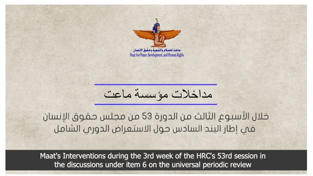 مداخلات مؤسسة ماعت خلال الأسبوع الثالث من الدورة 53 من مجلس حقوق الإنسان حول الاستعراض الدوري الشامل