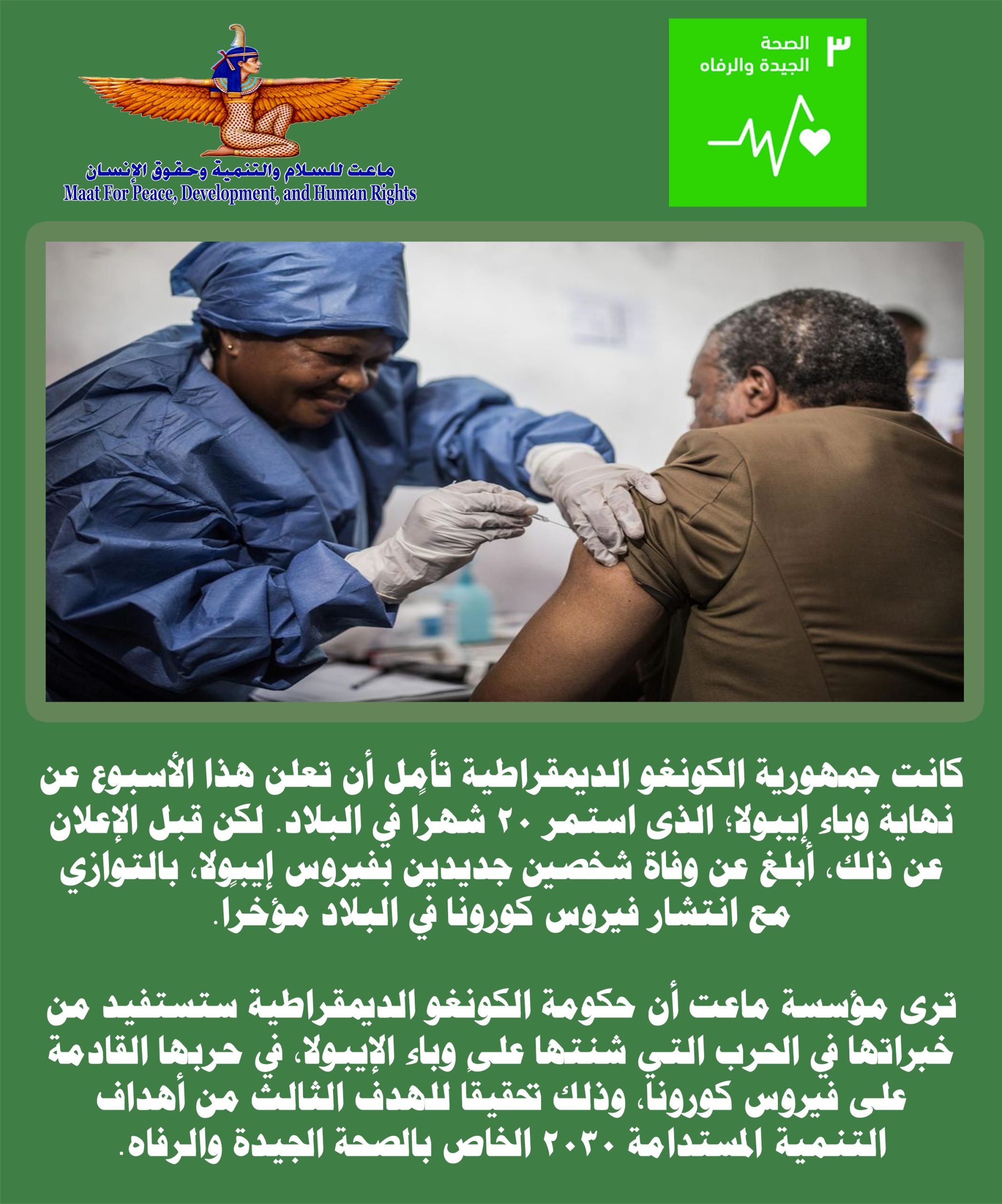 ترى مؤسسة ماعت للسلام والتنمية وحقوق الإنسان أن حكومة الكونغو الديمقراطية ستستفيد من خبراتها في الحرب التي شنتها على وباء الإيبولا، حتى وإن لم تكلل بعد بالنجاح التام، في حربها القادمة على فيروس كورونا، وذلك تحقيقًا للهدف الثالث من #أهداف_التنمية_المستدامة 2030 الخاص بالصحة الجيدة والرفاه.