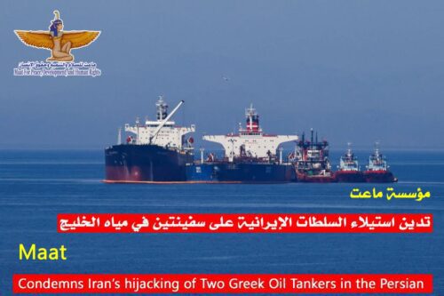 تدين مؤسسة ماعت للسلام والتنمية وحقوق الإنسان قيام السلطات الإيرانية باختطاف سفينتين يونانيتين في مياه الخليج العربي، وذلك بالمخالفة للقوانين والأعراف الدولية، وكان الحرس الثوري الإيراني أكد يوم الجمعة الماضي، احتجاز ناقلتي نفط يونانيتين “لانتهاكهما أصول الملاحة به”. ولم يحدد الحرس طبيعة المخالفات. وتطالب ماعت السلطات الإيرانية بضرورة الإفراج الفوري عن السفن التي استولت عليها وحماية أطقمها.