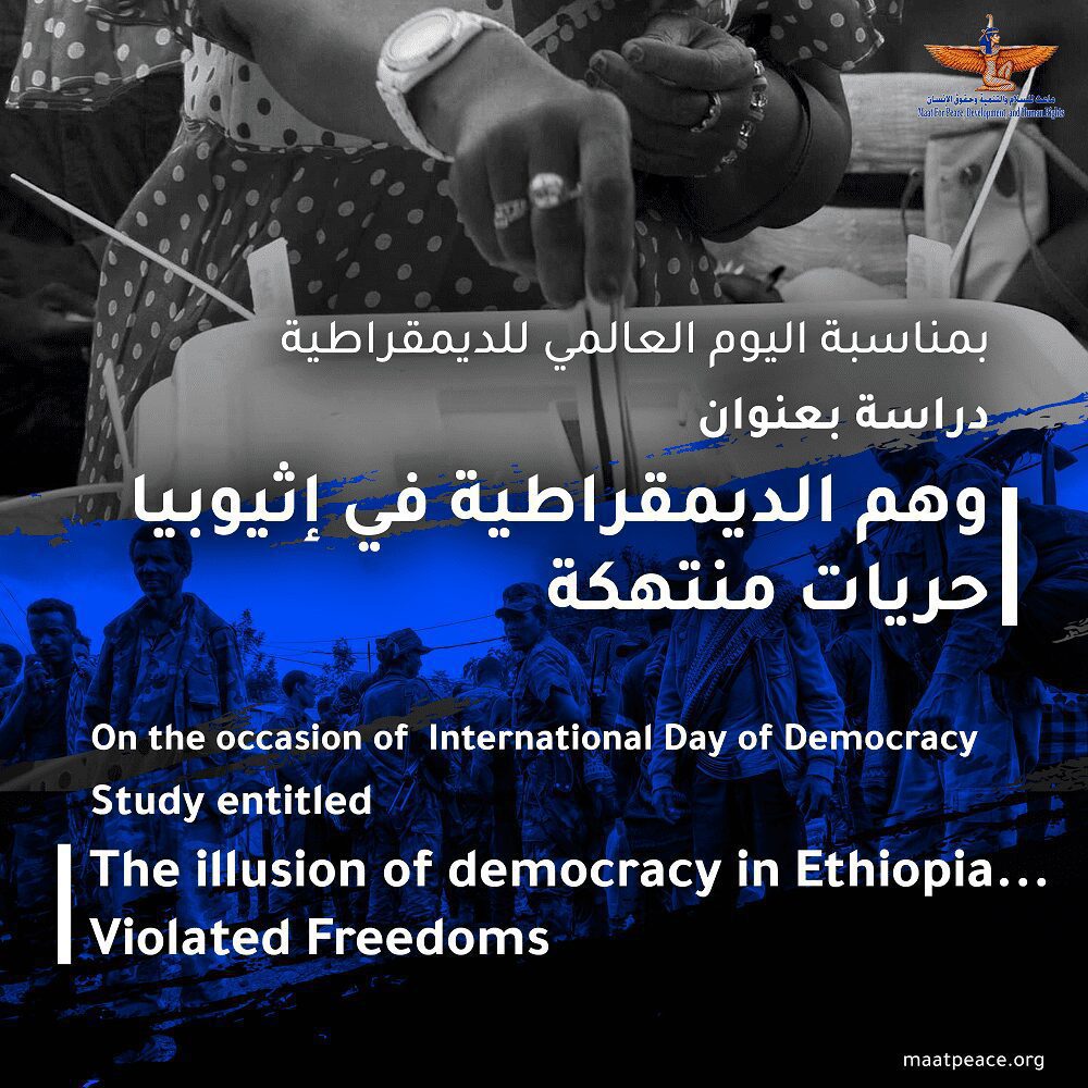 أشارت مؤسسة ماعت للسلام والتنمية وحقوق الإنسان إلى فشل الحكومة الإثيوبية في تطبيق معايير ومؤشرات الديمقراطية. جاء ذلك في دراسة حقوقية أطلقتها حول مؤشر الديمقراطية العالمي ومدى نجاح تطبيقه في دولة إثيوبيا الفيدرالية. وحصلت إثيوبيا على معدل نقاط حوالي 3.24 / 10 فيما يخص تطبيق مؤشرات الديمقراطية العالمية وذلك منذ عام 2017 حتى اليوم.