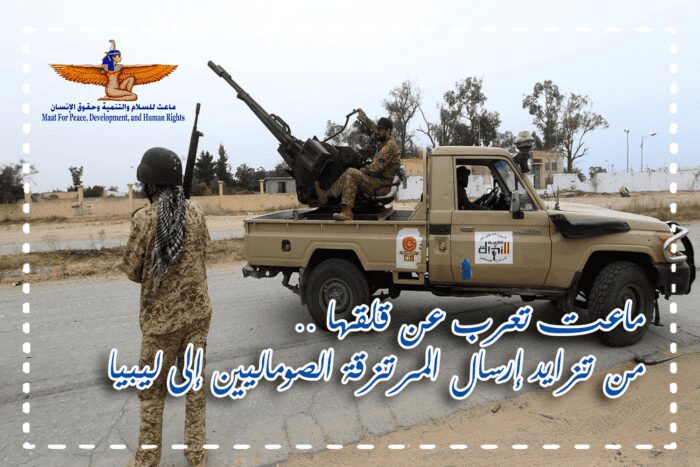 تعرب مؤسسة ماعت للسلام والتنمية وحقوق الإنسان عن قلقها إزاء تزايد الأنباء المتواترة عن تجنيد حكومتي #قطر و #تركيا لمئات من الشباب الصوماليين للمشاركة في الحرب الدائرة في #ليبيا، والذين وصل عددهم لنحو 2000 شاب صومالي، بينهم أطفال.