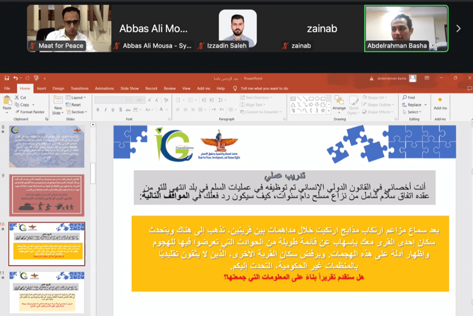 نظمت مؤسسة ماعت للسلام والتنمية وحقوق الإنسان، بالشراكة مع مجموعة الاستشارات الدولية للتدريب وأعمال المحاماة ورابطة تآزر للضحايا، ورشة عمل تدريبية افتراضية في 23 سبتمبر 2024 تحت عنوان” مبادئ وقواعد القانون الدولي الإنساني وتوثيق الانتهاكات الحقوقية”.