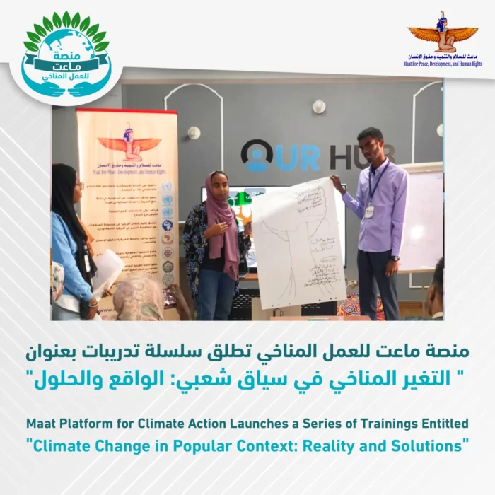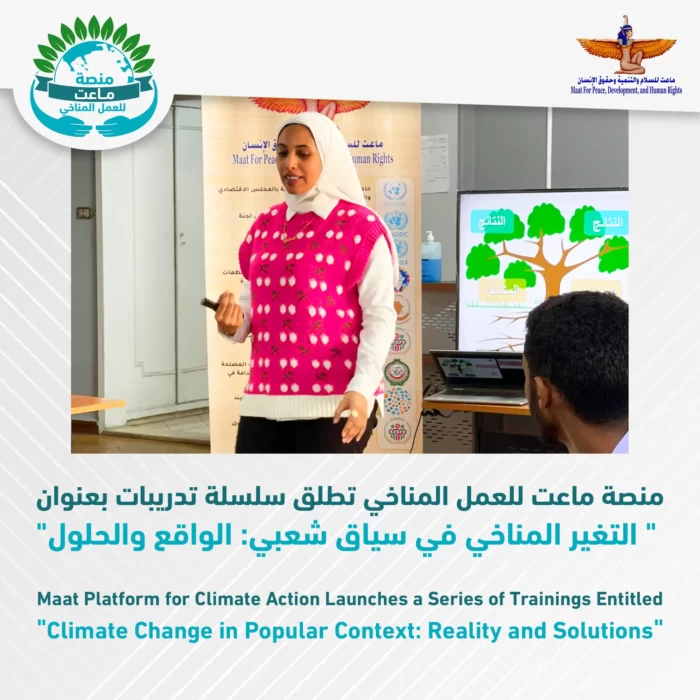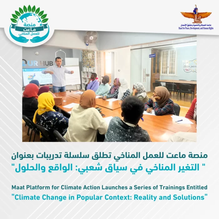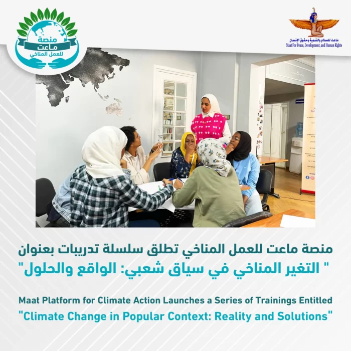 تحت منصة ماعت للعمل المناخي، تطلق مؤسسة ماعت للسلام والتنمية وحقوق الإنسان سلسلة من التدريبات وورش العمل لرفع قدرات المبادرات الشبابية والمنظمات حول ظاهرة التغير المناخي، والتي تأتي تحت عنوان “التغير المناخي في سياق شعبي: الواقع والحلول.”
