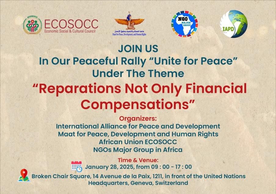 وفي هذا الصدد تنفذ مؤسسة ماعت للسلام والتنمية وحقوق الإنسان، بالتعاون والشراكة مع المجلس الاقتصادي والاجتماعي والثقافي للاتحاد الأفريقي، ومجموعة المنظمات غير الحكومية الكبرى في أفريقيا، والتحالف الدولي للسلام والتنمية، وقفة سلمية حول تأثيرات الاستعمار المستمرة حتى اليوم، والأشكال المختلفة في العصر الحالي من استعمار اقتصادي واستغلال للموارد وتبعية سياسية.. إلخ، في ظل صعوبة ورفض الحديث عن تعويضات عادلة عن فترات الاستعمار التقليدي بشكل ملائم، أو الاعتراف بالانتهاكات المرتكبة ضد تلك الشعوب لا سيما في قارة أفريقيا، وتتماشى تلك الوقفة السلمية مع ما اعتمده الاتحاد الأفريقي كشعار لعام 2025: “العدالة للأفارقة والأشخاص المنحدرين من أصل أفريقي من خلال التعويضات”.