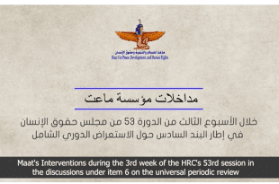 الأنشطة, الدورة-53, فيديو, مجلس حقوق الإنسانمداخلات مؤسسة ماعت خلال الأسبوع الثالث من الدورة 53 من مجلس حقوق الإنسان حول الاستعراض الدوري الشامل