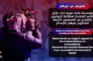 الاخبارمؤسسة ماعت توجه نداء عاجل للأمم المتحدة لمطالبة الحوثيين بالإفراج عن الصحفيين الأربعة المحكوم عليهم بالإعدام