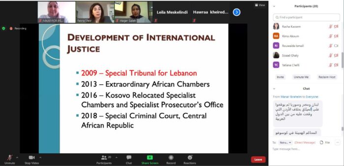 The sessions were presented by many international experts. On day 1, Dr. Karim El Mufti, an IHL expert, opened the webinar with a lecture entitled “Transitional Justice (Introduction ),” in which he explained the concept of transitional justice, in addition to its goals and basic mechanisms that are indispensable. Dr. Al-Mufti also touched upon the transitional justice system in Lebanon. Dr. Olga Kavran, an expert in international criminal law, the one in charge of liaison with the International Criminal Tribunal for the Former Yugoslavia (ICTY), and Head of Outreach and Legacy Unit at the Special Tribunal for Lebanon (STL), then addressed the development of international criminal justice, international courts and the types of international and specialized courts. The third speaker on the first day was Dr. Nidal El Jurdi, the former Acting Chief for the UNOHCHR in Tunisia, who discussed crimes against humanity and examined the idea that international criminal law entitles national courts to investigate crimes against humanity, and in the event that the procedures fail, the case can be escalated and referred to the International Criminal Court.