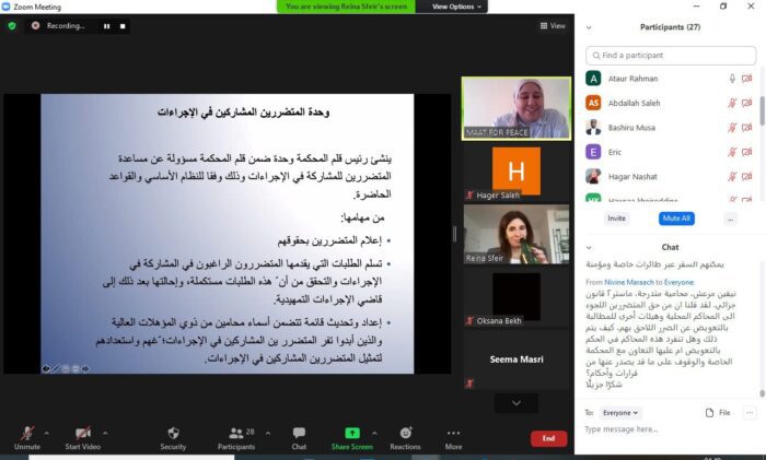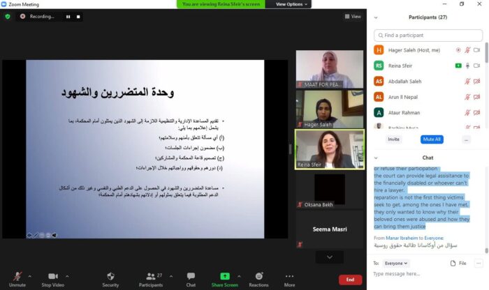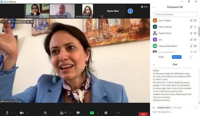 In cooperation with the International Humanitarian Law (IHL) initiative and law students, Maat for Peace, Development, and Human Rights organized a three-day introductory webinar on international criminal law and international criminal justice. The webinar was held on 23, 24, and 25 March, with the aim of enhancing the capabilities of law students, developing their skills, and introducing them to the work of international legal mechanisms, and it was attended by a large number of participants from different countries such as Libya, Somalia, Egypt, Kuwait, Lebanon, Syria, Iraq, Nepal, Bangladesh, Palestine, Morocco, Nigeria, Brazil, and Argentina.