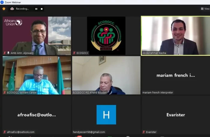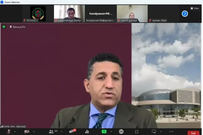 During the e-symposium, Ambassador Amr Aljowaily, the Strategic Advisor to the Deputy Chairperson of the African Union Commission (Partnerships and Stakeholder Engagement), explained the importance of evaluating the First Ten-Year Implementation Plan of Agenda 2063, in order to be able to formulate the Second Ten-Year Implementation Plan of Agenda 2063, to determine Africa’s path and vision of development. Aljowaily recommended African civil society organizations, holding a consultative status with the Economic and Social Council, to strengthen means of cooperation within the framework of the African Union and the United Nations to implement the 2063 and 2030 Agendas, in addition to making partnerships with other stakeholders contributing to the development process, in order to promote a results-based approach.