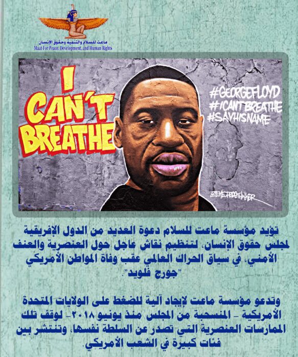 Maat Foundation for Peace, Development and Human Rights supports the call of many African countries to the United Nations Human Rights Council, to organize an urgent discussion on racism and security violence, in the context of the global movement following the death of the American citizen “# George Floyd”.